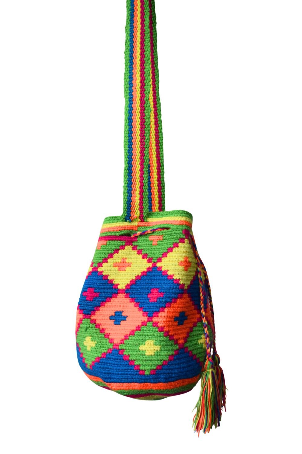 En esta mochila multicolor, Ana González, artesana Wayuu de larga trayectoria, entrelaza la fuerza cromática del desierto con la alegría profunda de su cultura. Los tonos verdes, naranjas, rosados y azules laten como la vida misma: representan la naturaleza, la comunidad y los sueños que se tejen a diario en La Guajira.