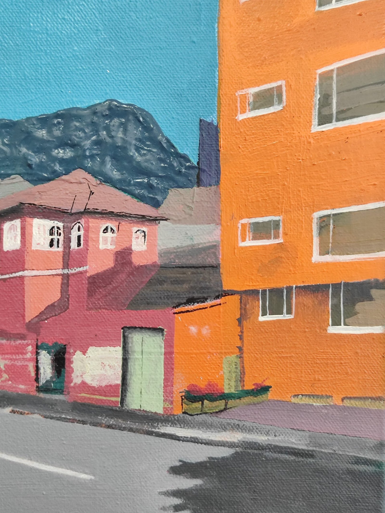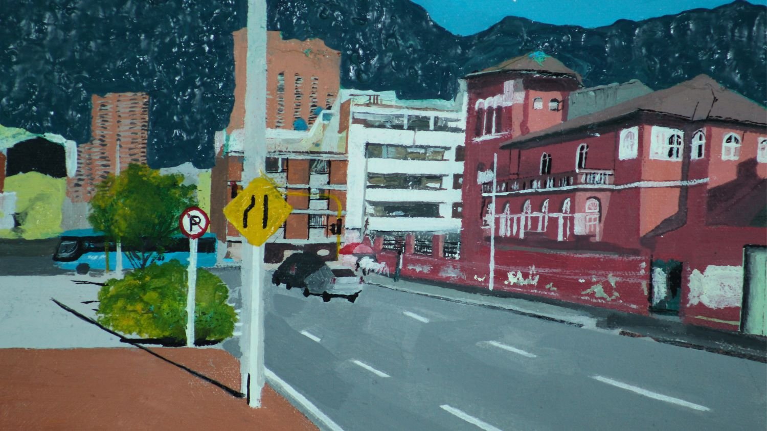 Esta obra retrata una esquina emblemática de Bogotá, donde una antigua quinta de estilo republicano se convierte en protagonista junto al cielo y las montañas. La casa abandonada, vestigio de una ciudad excluyente, se presenta como objeto decorativo en el marco pictórico de la Séptima. El paisaje urbano se revela como espacio compartido, aunque no siempre accesible.